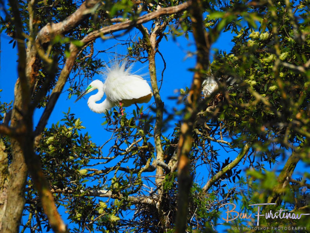 Roosting tablespoons develop long white plumes behind their head, which is also marked with a colourful spot just above the eyes.